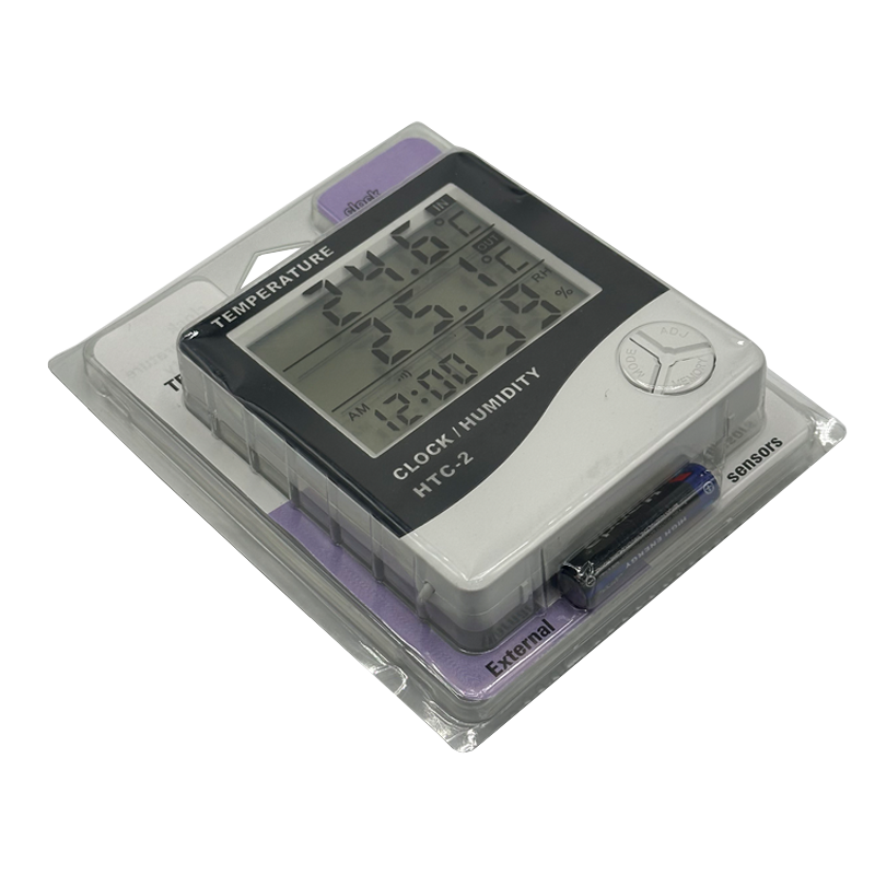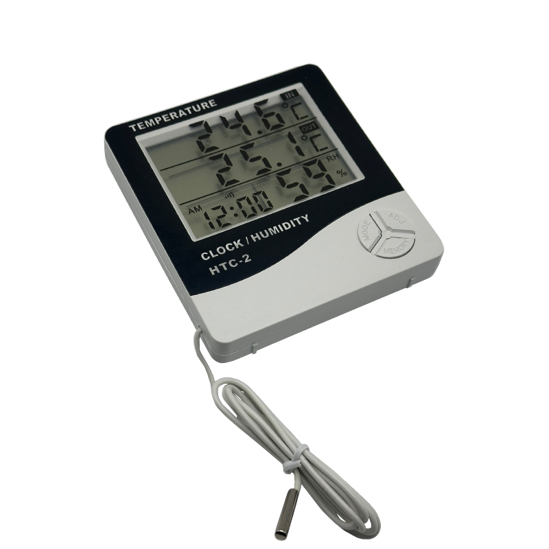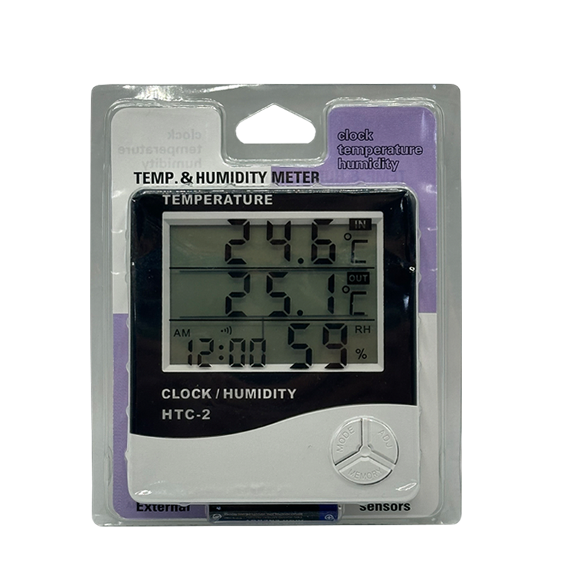 کنترل و دانستن دما و رطوبت محیط برای بسیاری از فعالیت ها نظیر پرورش گل و گیاه، نگهداری از حیوانات، پرورش میوه نیاز می باشد، همچنین برای کودکان نیز دانستن این دو پارامتر دارای اهمیت می باشد. برای سنجش دما و رطوبت محیط از دستگاه های رطوبت سنج و دماسنج استفاده می کنیم که به دو صورت دیجیتال و آنالوگ یا همان عقربه ای این دو پارامتر را برای ما اندازه گیری می نمایند. رطوبت سنج و دماسنج های دیجیتال دارای مدل و انواع مختلفی می باشد. دماسنج و رطوبت سنج دیجیتال HTC-2 از گروه محصولات ابزار سنجش سلامت برای اندازه گیری دما و رطوبت محیط بکار می رود. این دماسنج دیجیتالی محیطی بصورت رومیزی و یا دیواری قابل استفاده می باشد. این دما سنج دارای دو سنسور دما و یک سنسور رطوبت داخلی می باشد. سنسور دمای اول داخلی بوده و سنسور دمای دوم دارای سیم 1.5 متر می باشد. این رطوبت سنج دیجیتالی محیط دارای تاریخ و ساعت و حافظه ماکزیمم و مینیمم می باشد. دستگاه با یک باتری نیم قلمی چندین ماه کار می کند.