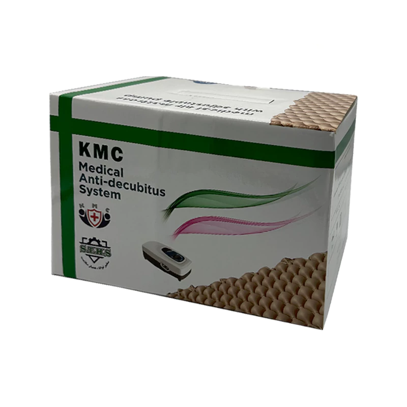 جنس تشک دستگاه کی ام سی از PVC پزشکی ضد حساسیت و آلرژی می باشد که باعث ایجاد خارش و قرمزی بر روی پوست نمی شود. بر روی موتور پمپ هوا این محصول یک دکمه برای تنظیم میزان هوای خروجی تعبیه شده که به صورت ولومی از 1 تا 5 متغیر می باشد، همچنین در پشت این موتور 2 عدد میله برای آویزان کردن موتور بر روی تخت بیمار یا هر جای دیگه ای ایجاد شده.