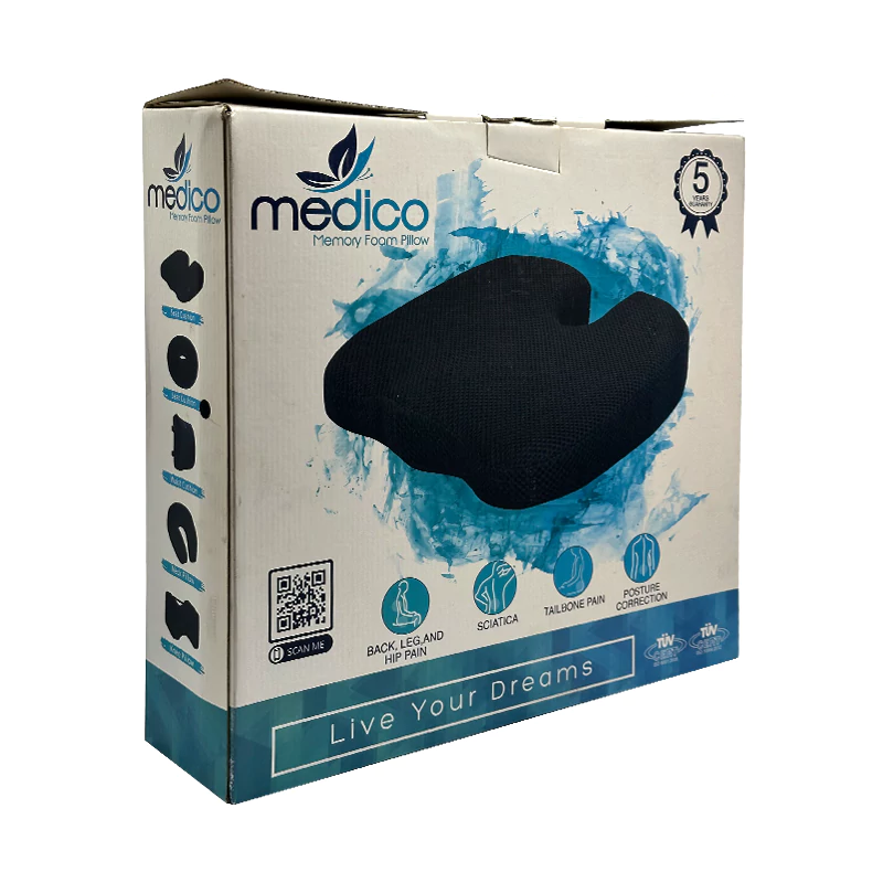 هدف از داشتن بالش نشیمنی مدیکو مموری فوم تسکین دادن به افرادی است که ساعت های طولانی درخانه، محل کار و یا حتی هنگام رانندگی مینشینند. محصولات مشابه هم تاثیر این بالشت را دارا هستند با این تفاوت که اکثرا باعث ایجاد فشار در پشت و کمر می شوند. علاوه براین بالشتکها به گونه ای طراحی شدهاند که شما را در بهترین وضعیت بدنی قرار داده و در کنار سایر مزایای دیگرش باعث تسکین دنبالچه میشود. این بالشتک درهنگام نشستن خاصیت درمانی ایجاد می کند حتی برای استفاده در طولانی مدت. شکل منحصربه فرد زیر نشیمنی دنبالچه طبی مدیکو نواحی تحت فشار را کاهش داده و از آسیبهایی که در اثر موقعیت قرارگیری بد دنبالچه بوجود می آید جلوگیری میکند. زیر نشیمنی دنبالچه طبی مدیکو از گروه محصولات طبی راحتی بسیار راحت و طبی با الیاف طبی طراحی و تولید شده است. جنس پارچه رویی این زیرنشیمن زنبوری محفظه دار بوده که ضد حساسیت می باشد. جنس الیاف مموری فوم بوده که از لحاظ وزن و طراحی به صورتی میباشد که به راحتی قابل حمل بوده و قابل استفاده بر روی صندلی، مبل و هر مکان دیگری میباشد.